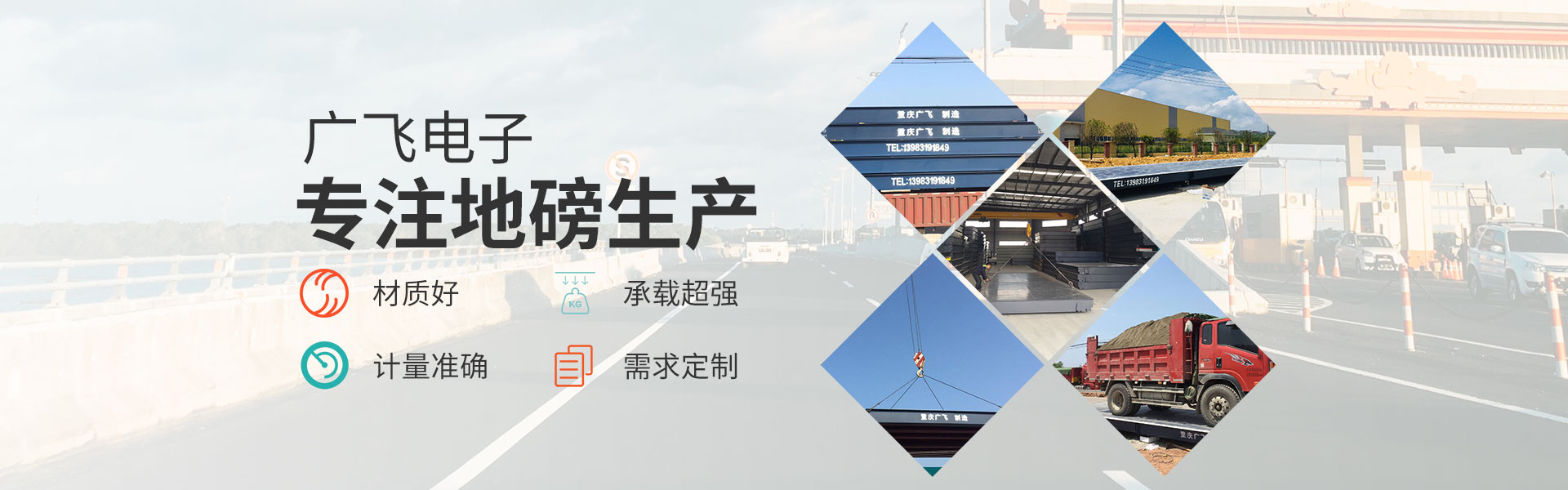 重慶廣飛電子有限公司,是一家集衡器生產(chǎn)、技術(shù)研發(fā)、產(chǎn)品銷售及售后服務(wù)于一體的高科技企業(yè)。 產(chǎn)品囊括電子汽車衡(電子地磅)、無人值守地磅稱重管理系統(tǒng)、電子地上衡、智能稱重管理系統(tǒng)、電子軌道衡、電子吊秤、電子臺秤、電子皮帶秤、鏟車秤、公路超載超限系統(tǒng)等全系列稱重產(chǎn)品。